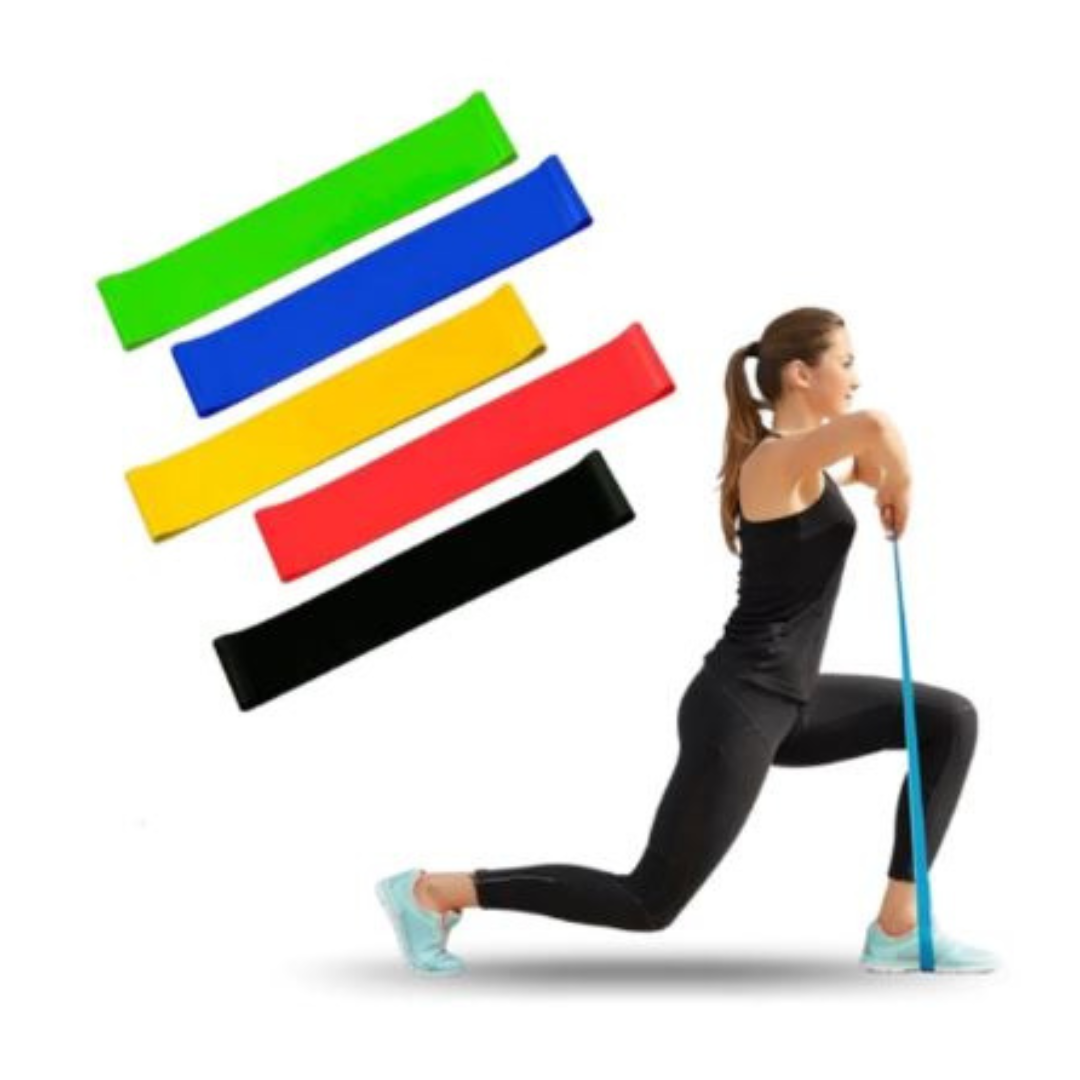 Kit de faixas elásticas com 5 níveis de resistência para fortalecimento e reabilitação.